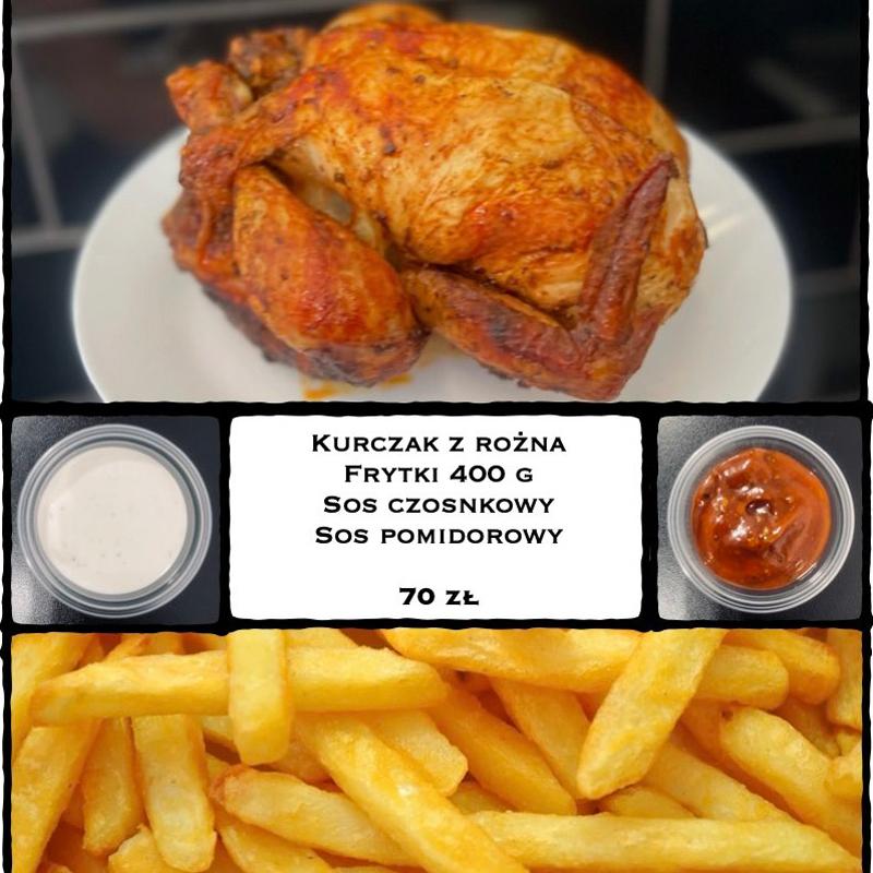 Kurczak z rożna, frytki 400g, sos czosnkowy, sos pomidorowy.